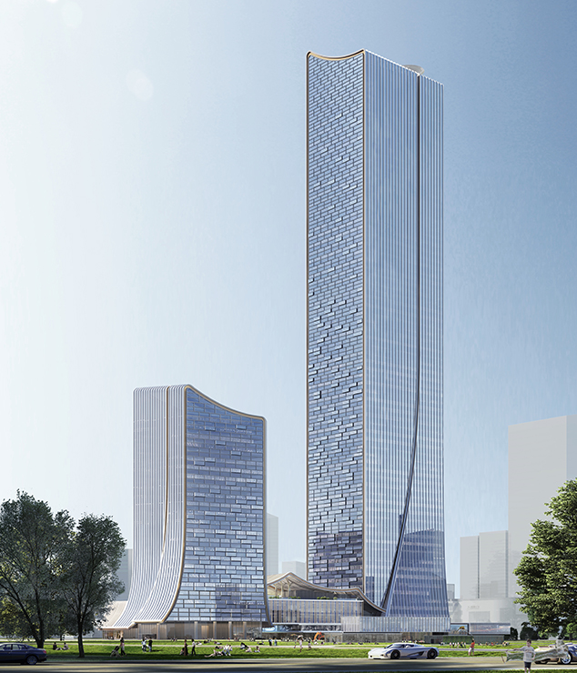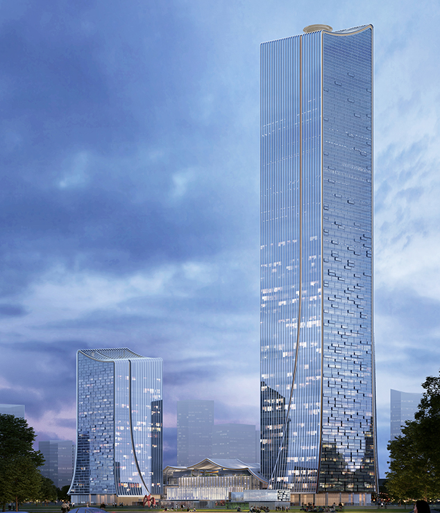 建筑高度:326.1m(65層) 幕墻面積:7.1萬m2 項目設計:Aedas建筑設計事務所 幕墻類型:單元式玻璃幕墻等