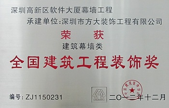“全國(guó)建筑工程裝飾獎(jiǎng)”是國(guó)家住房和城鄉(xiāng)建設(shè)部批準(zhǔn)設(shè)立的中國(guó)建筑裝飾行業(yè)的最高榮譽(yù)獎(jiǎng),由中國(guó)建筑裝飾協(xié)會(huì)主辦評(píng)選,每?jī)赡暝u(píng)選一次。此次深圳市方大裝飾工程有限公司一舉獲得四項(xiàng)“全國(guó)建筑工程裝飾獎(jiǎng)”,突顯了方大幕墻在建筑裝飾行業(yè)設(shè)計(jì)與施工水平等方面的優(yōu)勢(shì),反映了方大裝飾公司在企業(yè)管理、技術(shù)實(shí)力、質(zhì)量保證體系等方面的實(shí)力。