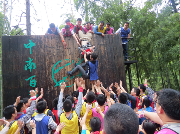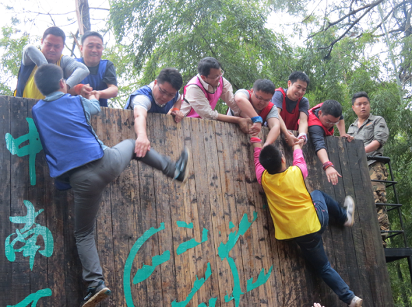 本次拓展訓練最感動人的項目莫過于最后的攀爬“畢業墻”,教官告訴大家:“沒有任何保險措施,什么道具都不能用,全隊學員必須在不違反規則的情況下,在規定的時間內全部翻越畢業墻才算成功,拓展訓練才算畢業。”怎么辦?只有團隊的力量才能翻越畢業墻,最后大家協商是第一排四個,一人手扶墻,一人抱緊對方的腰,其他人踩著他們的肩膀上去,先爬上去的人再用手拉下面的人上去,每一位隊員心中都暗暗鼓勵自己要勇敢,踩上隊員肩膀的時候,身后有幾十雙有力的手托住,一股力量在支持我們向上攀越,一種從未有的安全感油然而生,也充滿了勇氣。當所有人出色的翻越過畢業墻后,大家的眼睛已經濕潤了,最終的感動戰勝了辛苦。