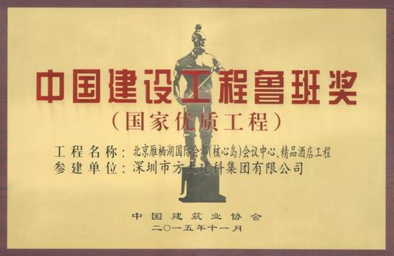 11月17日,中國建筑業協會在北京舉行中國建筑行業最高獎——2014~2015年度中國建設工程魯班獎(國家優質工程)表彰大會,在本屆魯班獎表彰大會中,方大集團股份有限公司全資子公司深圳市方大建科集團有限公司憑借精心打造的高標準、高質量幕墻工程的北京雁棲湖國際會都精品酒店,獲得2014~2015年度中國建設工程魯班獎,“方大品質”作為“深圳質量”的典范再度被全國建筑工程領域所矚目。