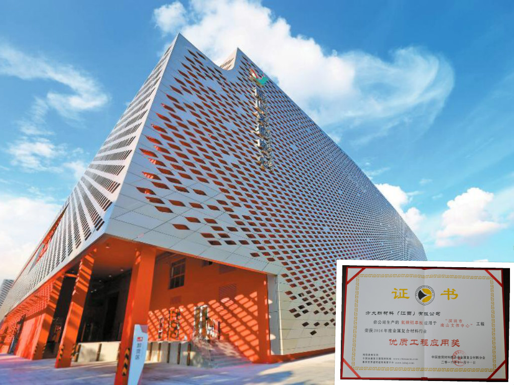 近日,在2016中國建筑材料聯(lián)合會“金屬復合材料分會年會暨行業(yè)創(chuàng)新論壇”大會上,方大新材料(江西)有限公司獲“優(yōu)秀品牌”榮譽稱號,公司生產(chǎn)的青花瓷鋁單板、氟碳鋁單板分別應用于南昌萬達文化旅游城、深圳南山文體中心等工程,榮獲2016年度金屬復合材料行業(yè)“優(yōu)質(zhì)工程應用獎”。
