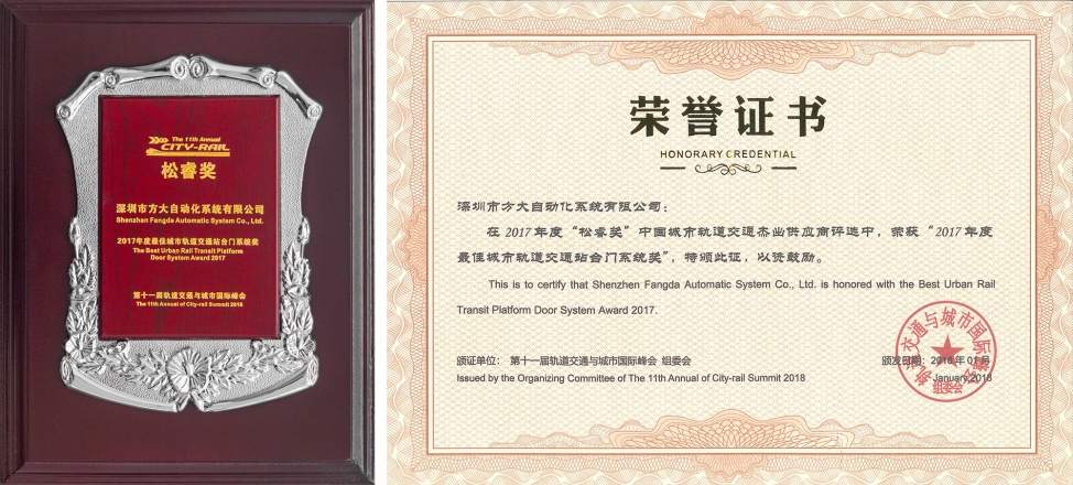 1月10日,第十一屆軌道交通與城市國際峰會在深圳舉行,峰會對在軌道交通行業(yè)有突出貢獻的企業(yè)進行了表彰,方大集團股份有限公司全資子公司深圳市自動化系統(tǒng)有限公司獲頒“2017年度最佳城市軌道交通站臺門系統(tǒng)獎”。“松睿獎”是中國城市軌道交通優(yōu)秀供應(yīng)商獎,嘉獎和推介在軌道交通領(lǐng)域具備創(chuàng)新技術(shù)和做出杰出貢獻的企業(yè)。