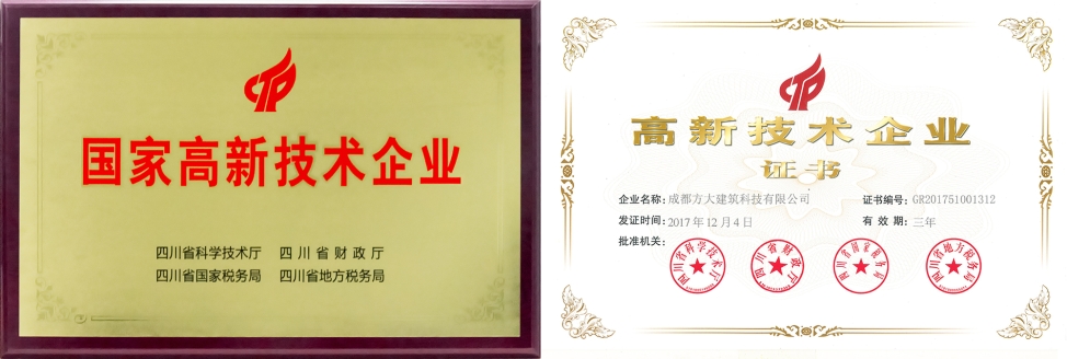 2018年1月,方大集團股份有限公司全資子公司成都方大建筑科技有限公司被認定為國家高新技術企業。