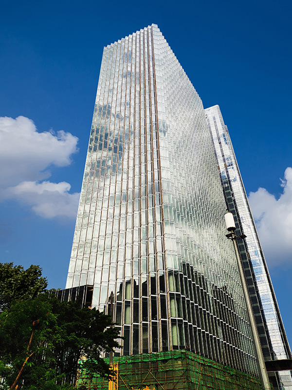 深圳·萬科濱海置地大廈位于深圳市福田區,幕墻類型主要是鋸齒狀單元式玻璃+石材+穿孔鋁板幕墻。項目塔樓采用L型和I型單元板塊組成,面板采用蜂窩石材、中空夾膠玻璃和穿孔鋁板。為了增強幕墻系統的通風性能,在穿孔鋁板后側設置了內開的鋁板窗。鋸齒狀的幕墻類型和特色材料的組合使該項目成為濱河大道上的一道靚麗風景,同時也給設計施工帶來了難題,項目團隊通過三維模擬確保L型板塊與I型板塊精確插接,對使用高度157m的蜂窩石材連接方案進行了加強措施,并順利通過幕墻專家專項的評審。