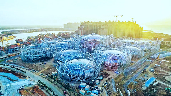 海口·恒大海花島位于海南省儋州市,該島由三個既獨立又緊密相連的離岸式島嶼組成,從高空俯瞰,形狀猶如一朵盛開的鮮花。方大建科承建國際會議中心幕墻工程,由9個單獨的球型建筑組成,各球體幕墻采用了玻璃面板。項目團隊攻克異形幕墻設計施工、鋼結構屋蓋跨度大以及施工作業面小等難題,與業主攜手并肩,互相激勵,不辭一切加快1#島項目建設,為海花島的開業打下了堅實的基礎。